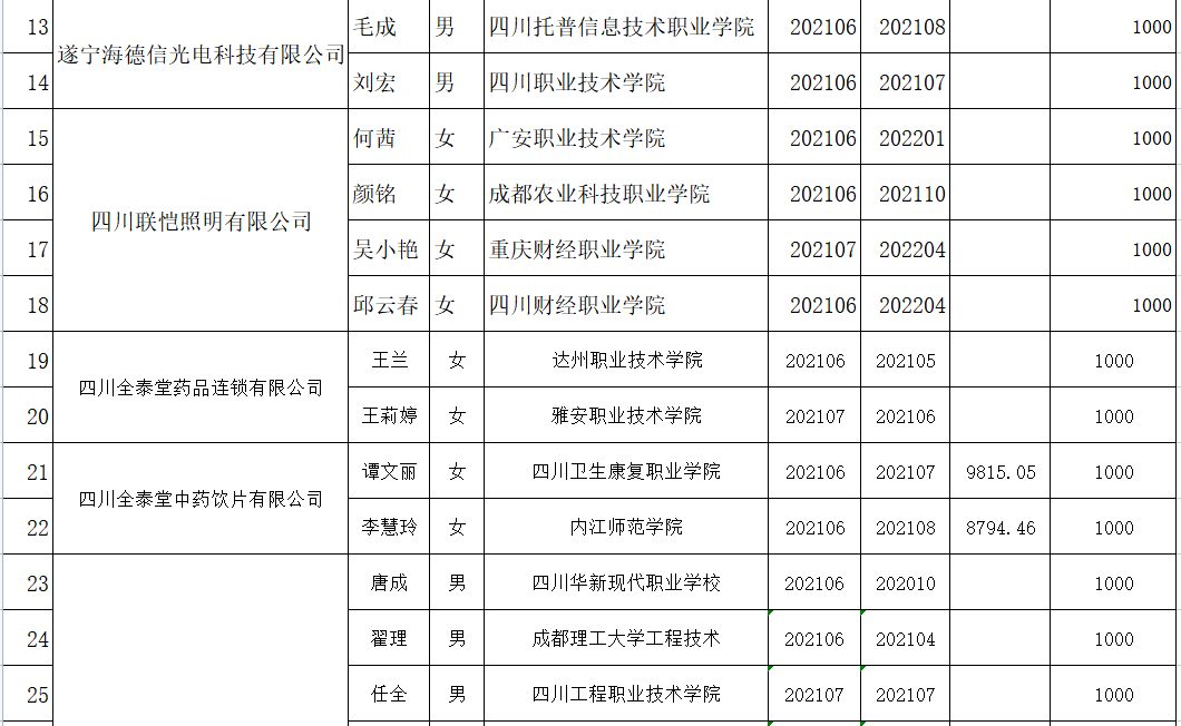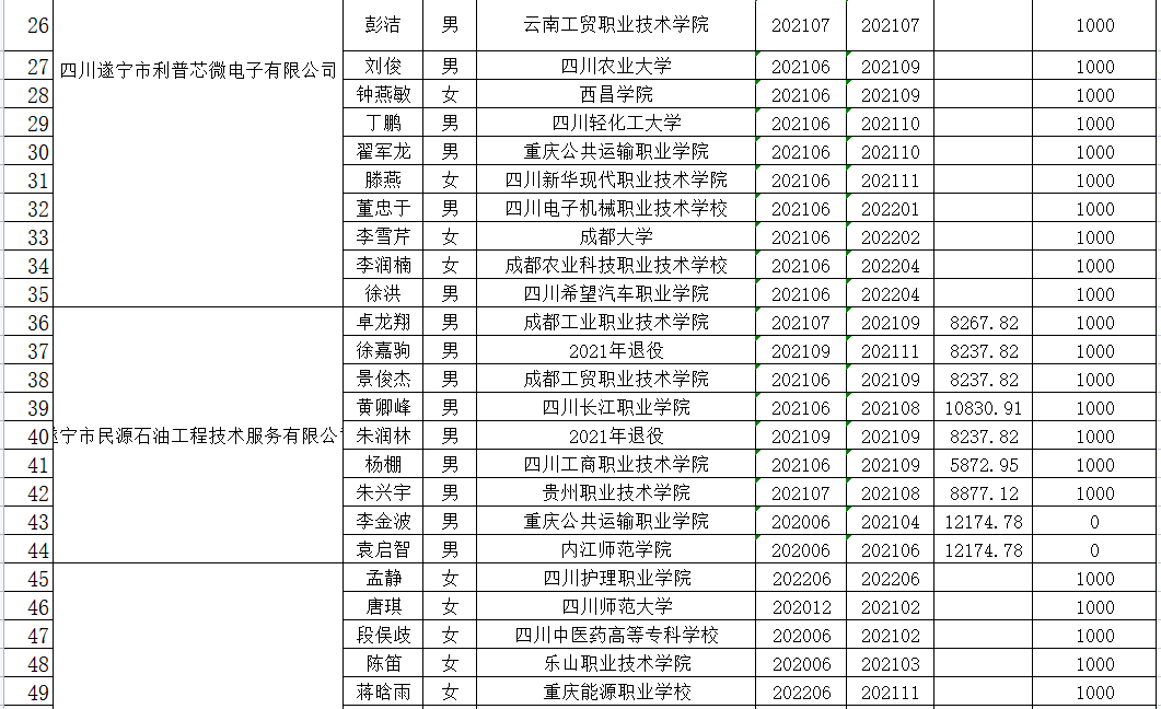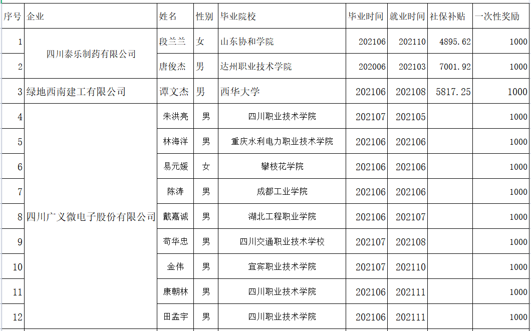 按照《遂宁市人民政府关于印发进一步稳定和扩大就业十八条政策措施的通知》(遂府函〔2022〕74号)精神,我区受理了四川联恺照明有限公司吸纳高校毕业生就业相关补贴的申请,经核,符合条件19人,应补贴金额19000元。现将受理审核情况向社会公示,公示期5个工作日,自2022年7月11日至7月15日。公示期间,如有问题和意见,请及时向遂宁经济技术开发区劳动保障与民政事务局反映。