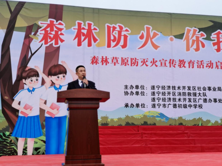 2月24日,“森林防火·你我同行”森林草原防灭火宣传教育活动启动仪式在广德中学举行,遂宁经开区社事局联合区消防救援大队、广德街道办事处、西宁卫生院相关人员以及区内各中小学分管安全的副校长、广德中学的全体师生1900余人参加启动仪式。