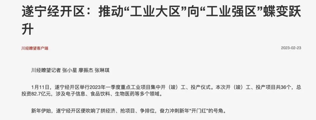 1月11日,遂宁经开区举行2023年一季度重点工业项目集中开(竣)工、投产仪式。本次开(竣)工、投产项目共36个,总投资82.7亿元,涉及电子信息、食品饮料、生物医药等多个领域。