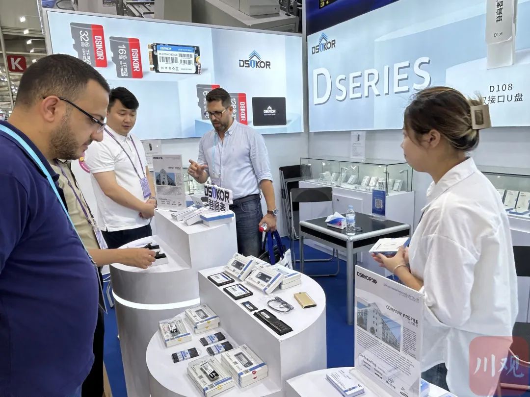 在和恩泰的展位上,不时有采购商光临展位,了解产品的使用场景和性能。“我们带来了企业的‘拳头’产品,包括固态硬盘、内存条、U盘、指纹加密固态U盘等。”四川和恩泰半导体有限公司董事长邓飞宇表示,这是公司第3次参加广交会,希望通过广交会平台“链接”全球,突出公司先进产业和科技支撑,展示更多创新产品,争取更多订单。
