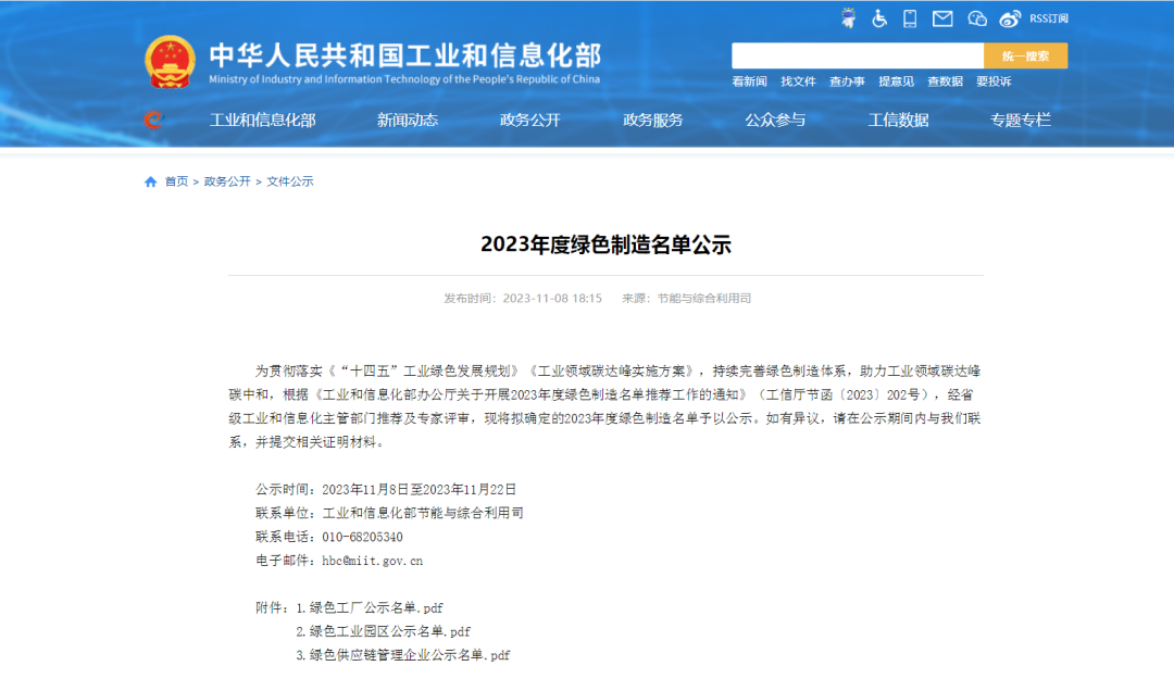为贯彻落实《“十四五”工业绿色发展规划》《工业领域碳达峰实施方案》,持续完善绿色制造体系,助力工业领域碳达峰碳中和,根据《工业和信息化部办公厅关于开展2023年度绿色制造名单推荐工作的通知》(工信厅节函〔2023〕202号),经省级工业和信息化主管部门推荐及专家评审,现将拟确定的2023年度绿色制造名单予以公示。如有异议,请在公示期间内与我们联系,并提交相关证明材料。