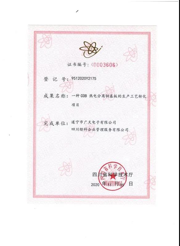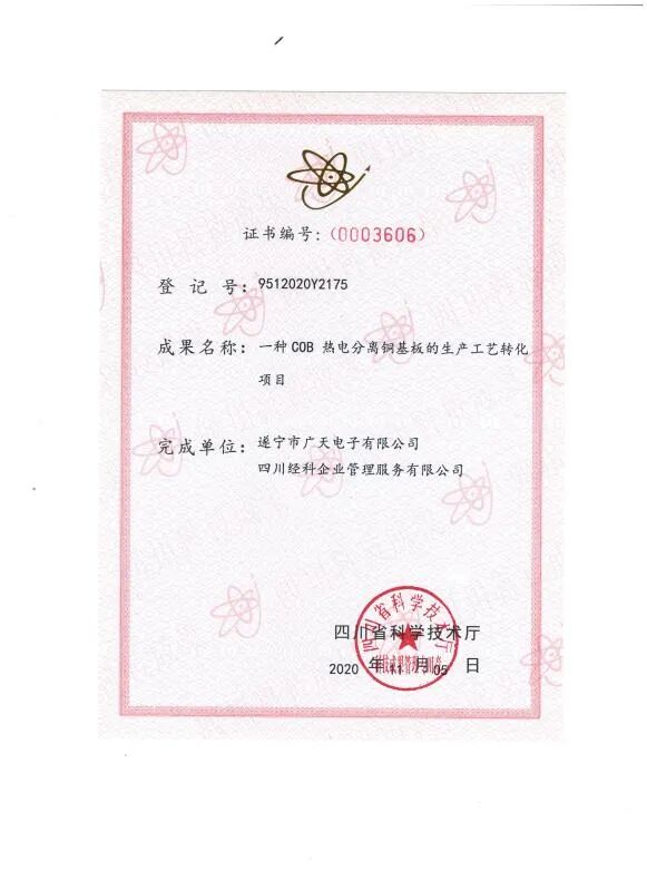 11月5日,遂宁经开区广天电子和经科企管联合完成的“一种COB热电分离铜基板的生产工艺转化项目”经四川省科技厅批准,取得四川省省级科技成果登记证书。