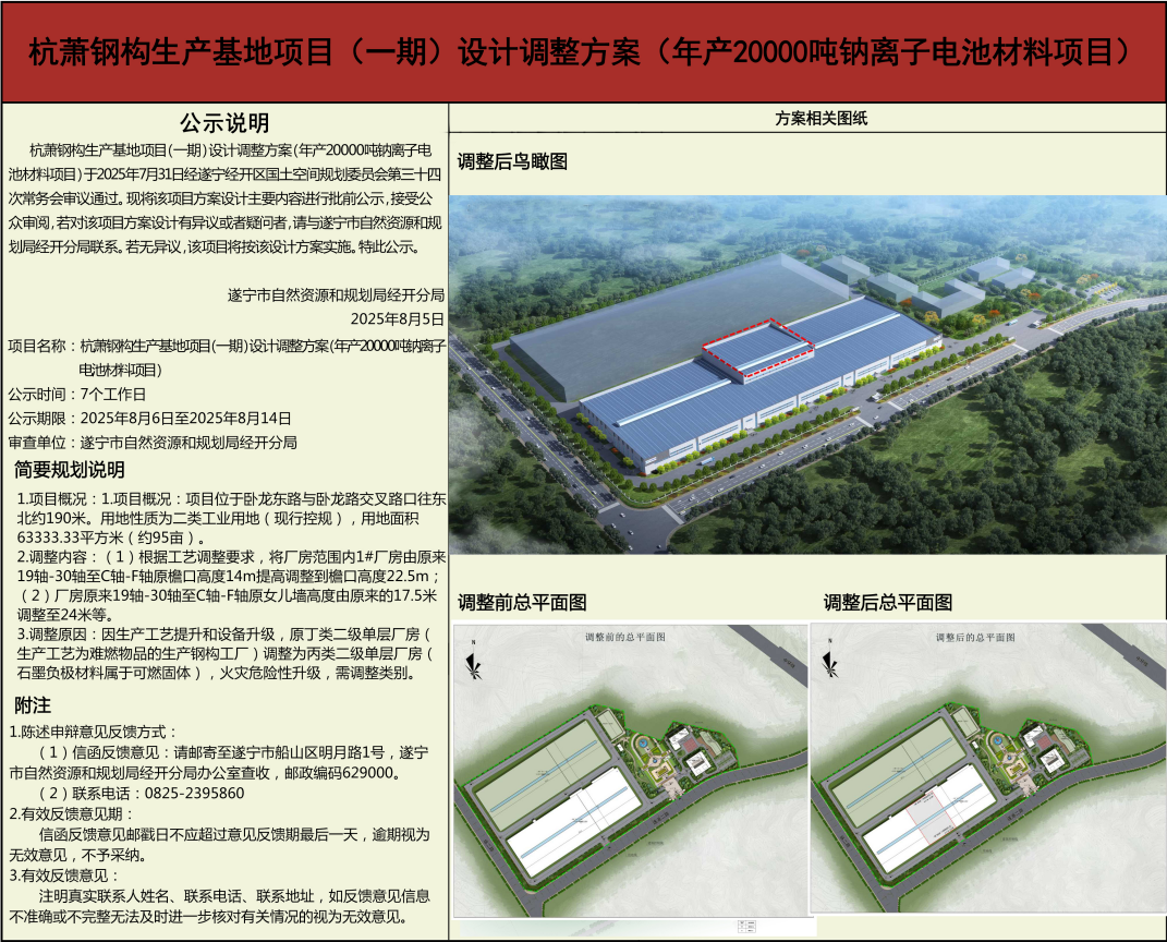 杭萧钢构生产基地项目(一期)设计调整方案(年产20000吨钠离子电池材料项目)