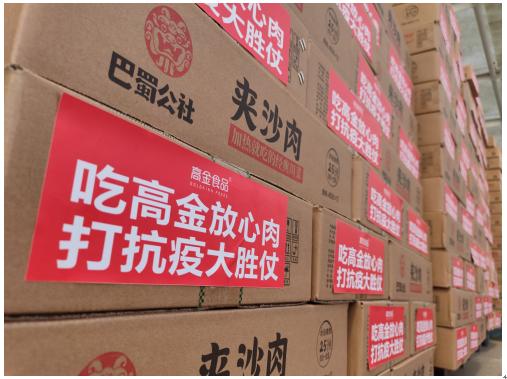 2020年2月,武汉新冠疫情发生后,高金食品迅速成立紧急应对小组,调动多种渠道加班加点紧急筹措物资,并严格检验产品,仅用一天时间就备足价值20万元的物资,并从遂宁总部出发,将物资驰援至武汉疫区。新冠疫情几年来,面对各地此消彼长的疫情态势,高金食品各地子公司及业务版块利用自身产品优势,匹配打造“抗疫能量包”并捐献给一线抗疫人员,旨在“你为民众排忧解难,我想让你好好吃饭!”。