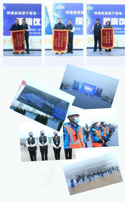 蜂巢能源遂宁项目从今年6月25日开始建设,经过6个月的奋战,从一块空旷无垠的土地到高耸挺拔的建筑封顶,凝聚了一大批人的智慧与汗水。活动现场,蜂巢能源还为遂宁经开区、上海宝冶、开达公司赠送锦旗,感谢各方单位的鼎力支持。