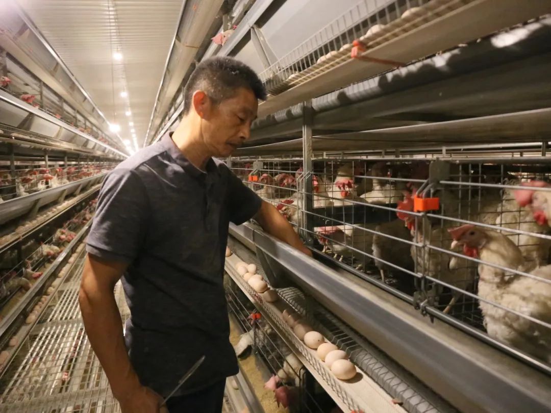 走进8万羽鸡智能化养殖厂房里,金黄的玉米粒与艾草粉在自动化料塔中翻滚,一枚枚带着艾草清香的鸡蛋顺着传送带滑入集蛋槽,总经理梁玉蓉正弯腰查看鸡蛋分拣线的运转情况。