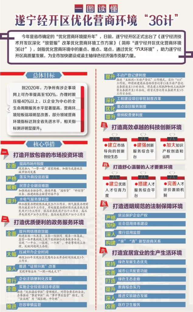 日前,《遂宁经济技术开发区深化"放管服"改革优化营商环境工作方案》(以下简称《工作方案》)正式出台,其中具体的"36条"内容,也为遂宁经开区优化营商环境破解企业发展难题提供了"36计"。