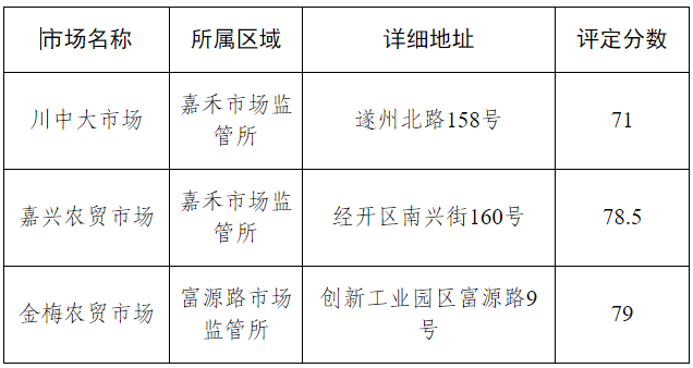经市场管理方自愿申报、市场监管所初步审核、区委属相关部门专家现场评定,川中大市场、嘉兴农贸市场、金梅农贸市场符合规范化建设A级标准。按照《四川省食用农产品集中交易市场食品安全规范化建设等级评定办法》相关要求,现将名单进行为期7天的社会公示,公开征求群众意见。