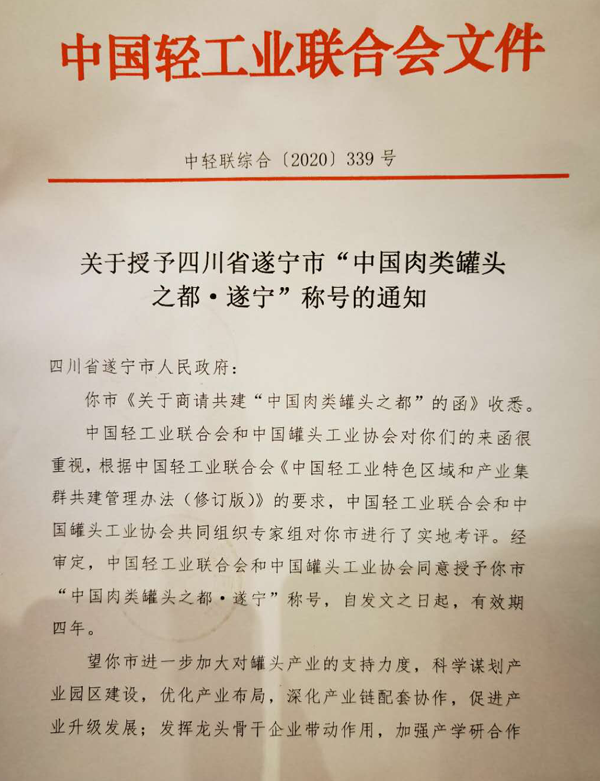 会议宣布授予遂宁市“中国肉类罐头之都·遂宁”称号,全国唯一落户遂宁。
