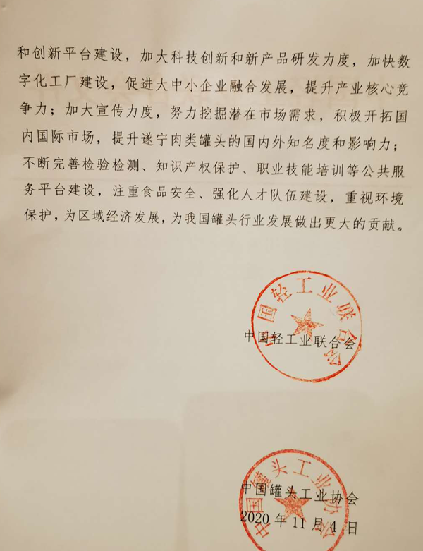 中国轻工业联合会、中国罐头工业协会希望遂宁市进一步加大对罐头产业的支持力度,科学谋划产业园区建设,优化产业布局,深化产业链配套协作,促进产业升级发展;发挥龙头骨干企业带动作用,加强产学研合作和创新平台建设,加大科技创新和新产品研发力度,加快数字化工厂建设,促进大中小企业融合发展,提升产业核心竞争力;加大宣传力度,努力挖掘潜在市场需求,积极开拓国内国际市场,提升遂宁肉类罐头的国内外知名度和影响力;不断完善检验检测,知识产权保护、职业技能培训等公共服务平台建设,注重食品安全、强化人才队伍建设,重视环境保护,为区域经济发展,为我国罐头行业发展做出更大的贡献。