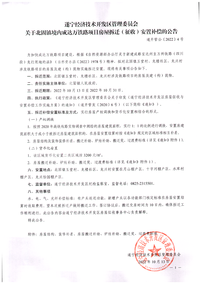 关于北固镇境内成达万铁路项目房屋拆迁(征收)安置补偿的公告(遂开管公[2022]4号)