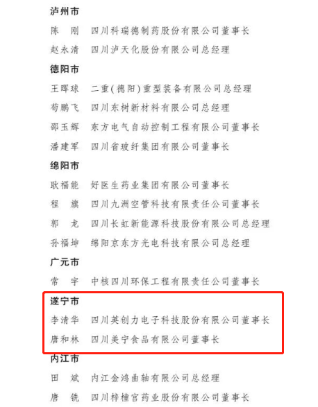 9月21日,记者从四川省人民政府网站获悉,日前,为进一步推动全省各类创新型企业蓬勃发展、竞相成长,决定对在2022年度科技创新工作中表现突出50家科技创新领军企业、48名科技创新领军企业家予以通报表扬。遂宁经开区2名企业家——四川英创力电子科技股份有限公司董事长李清华、四川美宁食品有限公司董事长唐和林获表扬。