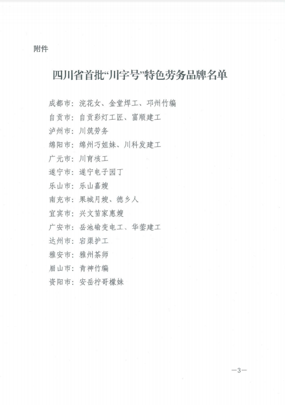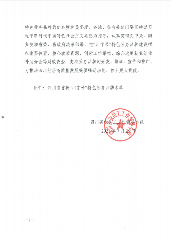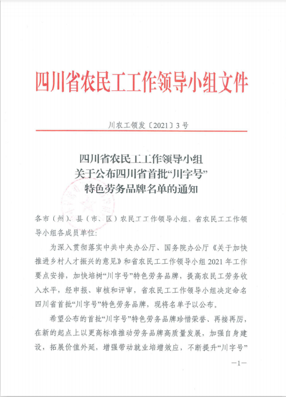 为深入贯彻落实中共中央办公厅、国务院办公厅《关于加快推进乡村人才振兴的意见》和省农民工工作领导小组2021年工作安排部署,加快培树“川字号”特色劳务品牌,提高农民工劳务收入水平,经申报、审核和评审,我区“遂宁电子园丁”劳务品牌被省农民工工作领导小组决定命名为四川省首批“川字号”特色劳务品牌。