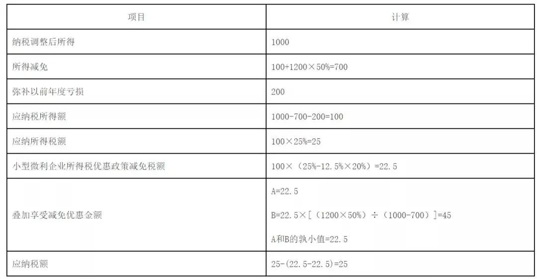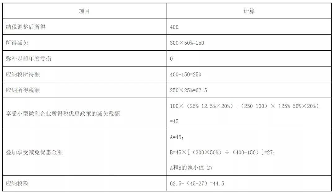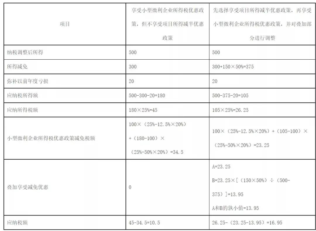 下面,以小型微利企业为例说明叠加享受减免税优惠的计算方法。企业选择享受其他减免所得税优惠政策,可据此类推。
