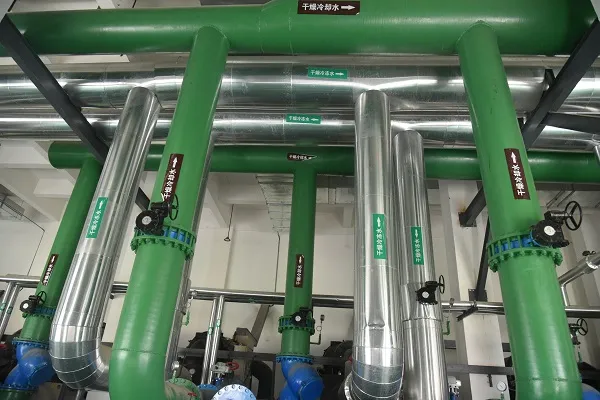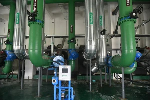 这是厂区内部的冷冻水机房,是整个水循环的核心:现场设备需要5°C的冷冻水来保温,需通过智能设备进行制冷,制冷所用到的常温水便来源于废水的回收利用。这些废水通过管网来到机房屋顶的冷却塔进行主体散热,通过风冷原理对水降温,以常温水作为补足水,大大降低了以前直接使用自来水的耗水量。