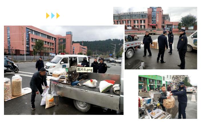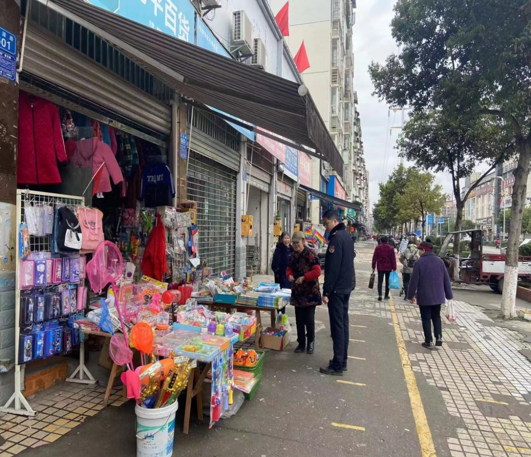 执法人员在新桥镇飞虹路劝导坐商勿占道经营