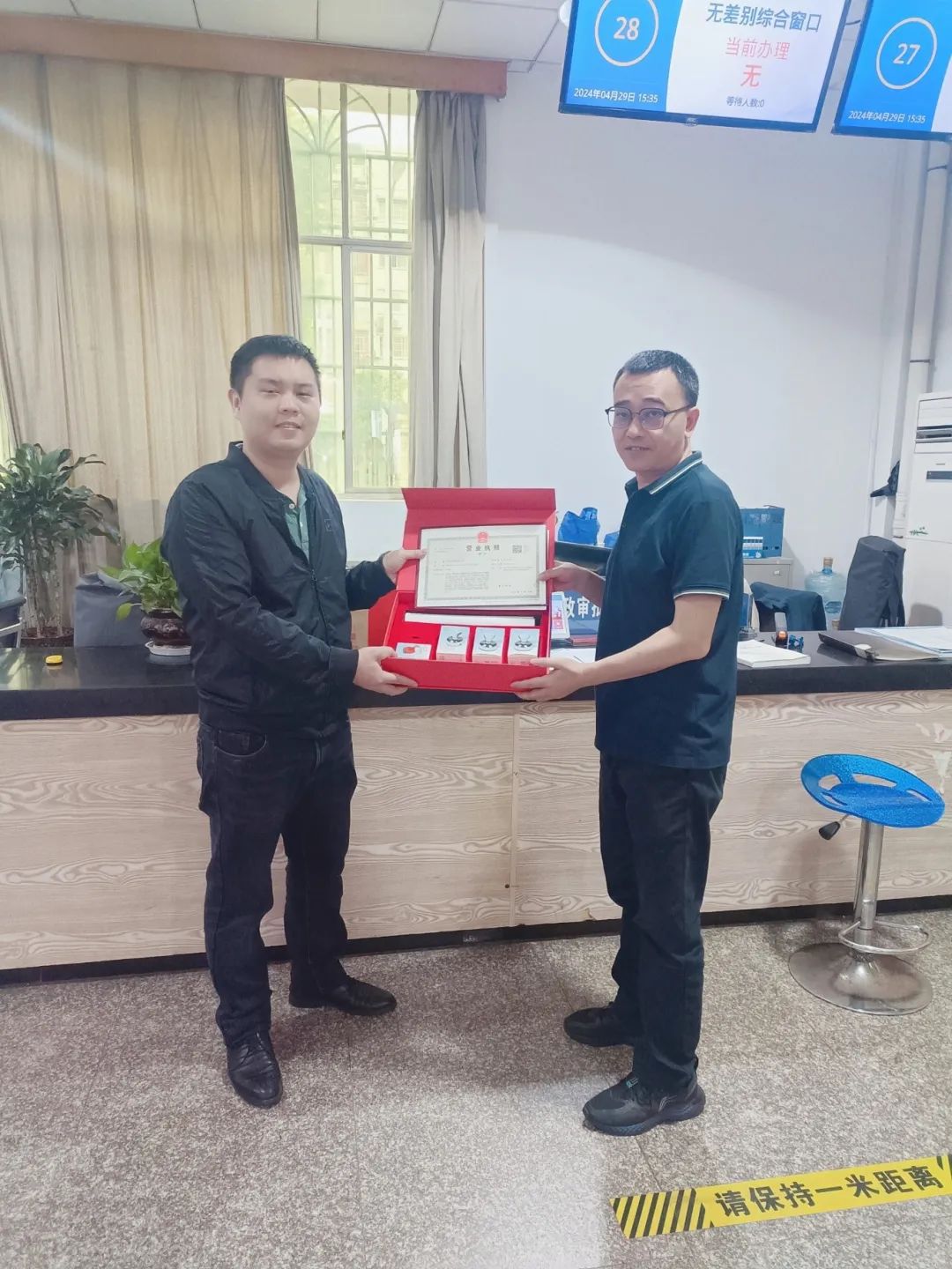 工作人员仔细检查并核对申请材料,利用为企服务专区实行帮办代办、特事特办,通过数字化政务服务一体化平台,实现线上线下无缝衔接,从而为企业提供了便捷、高效的政务服务,以最快速度出证。下午2点左右,该企业负责人满意地拿到了营业执照。与此同时,工作人员还联系企业选择的“零费用”公司,安排印章工作人员在现场帮其准备材料,大约20分钟完成了印章领取。