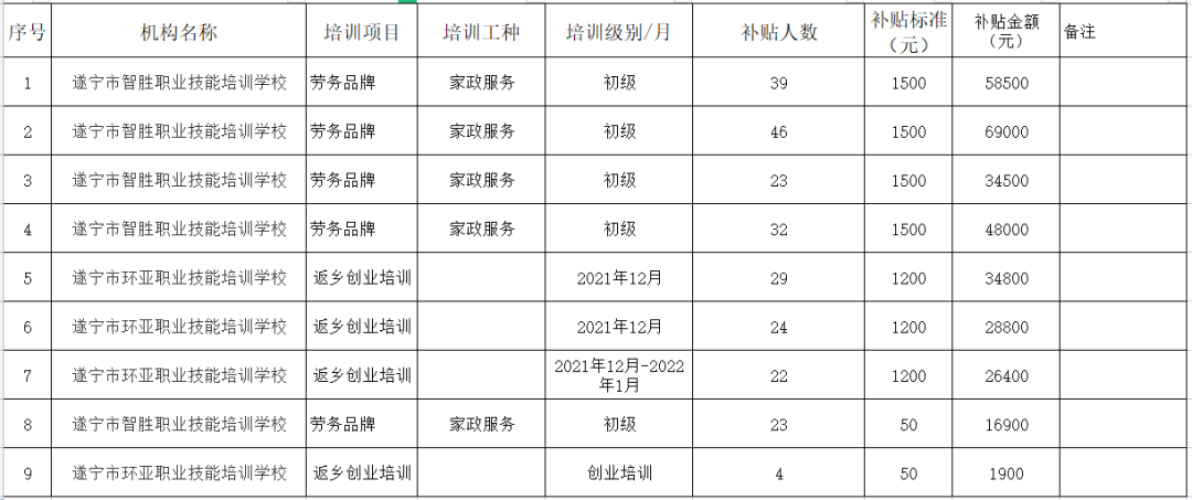 根据人力资源社会保障部办公厅、财政部办公厅《关于做好职业技能提升行动专账资金使用管理工作的通知》要求,现将2022年2月技能提升行动培训补贴情况予以公示。补贴机构共计2家,涉及补贴资金318800元,涉及补贴人员215人,如有情况反映,请于3月2日前与遂宁经济技术开发区劳动保障与民政事务局联系。