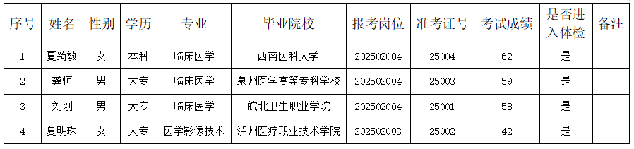 2025年医疗卫生辅助岗招募人员笔试成绩及体检有关事项的公告