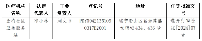 根据《卫生行政许可管理办法》《医疗机构管理条例》《医疗机构管理条例实施细则》等法律法规文件精神,我局依法受理了金梅社区卫生服务站医疗机构执业许可证的注销申请,现依法予以注销,特此公告如下: