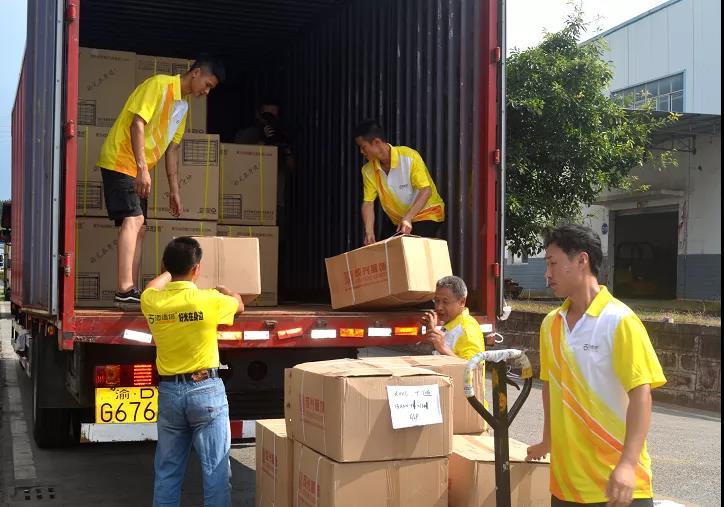 7月26日下午,在遂宁经开区遂宁海德信光电科技有限公司厂区内,工作人员正忙着将紫外线杀菌灯、衣服、口罩等救灾物资搬运上车,准备发往河南灾区。